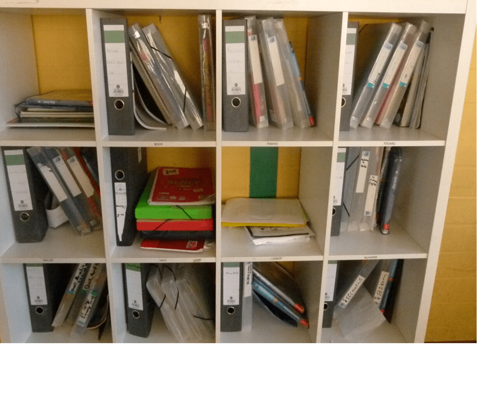 Die meisten Klassen haben ein Regal, in dem ihre Ordner oder Schnellhefter reingelegt werden.