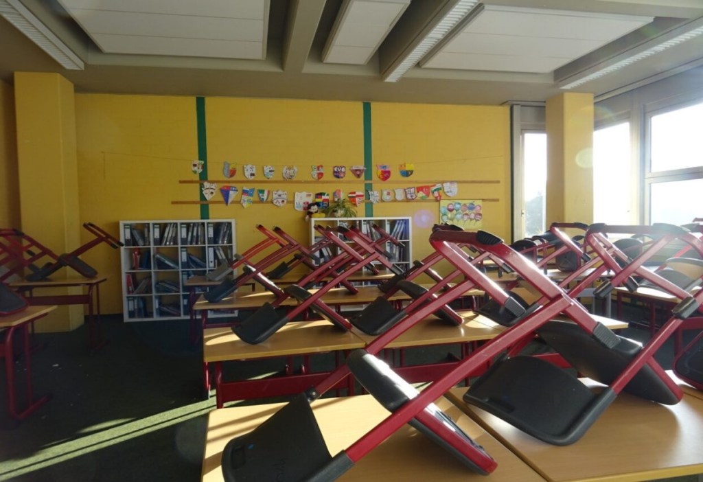 Nach dem Unterricht stellen wir die Stühle hoch, damit die Putzfrauen gut sauber machen können.