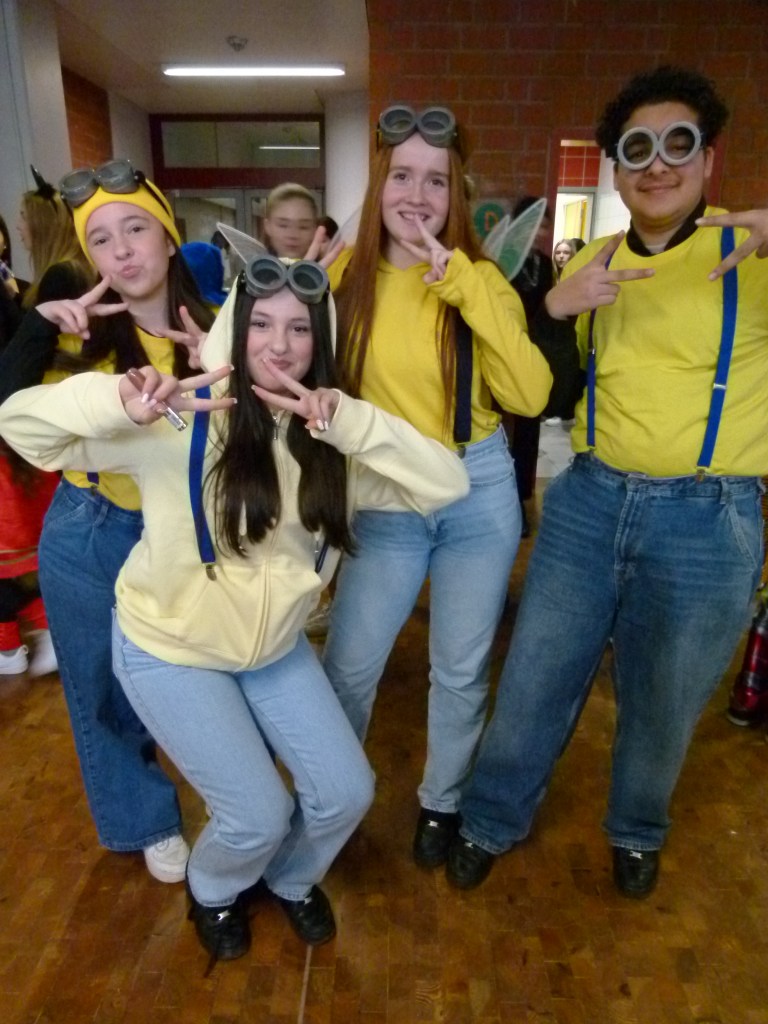 In den ersten beiden Stunden wurde in der Klasse gefeiert, man hörte Musik und frühstückte zusammen. Dann so gegen 10:11 Uhr begann die richtige Party in der Schulstraße. Man konnte viele tolle Sachen machen, z.B. einen Bobbycar Parkour, sich schminken lassen, Fußball spielen und noch vieles mehr. Außerdem konnte man sich auch viele leckere Sachen kaufen, z.B. Waffeln, Crêpes, Hotdogs, Nachos, Kuchen, Muffins und vieles mehr… Um 11:11Uhr kam Prinz Dennis in die Aula und hat mit allen gefeiert. Hier konnte man auch die vielen Kostüme bestaunen, zum Beispiel eine Gruppe Minions (siehe Foto). Danach sind alle wieder in ihre Klassen gegangen und haben ihre Klassenräume aufgeräumt. Um 12:40 Uhr war Schulschluss und wir durften nach Hause gehen. Der Tag hat uns großen Spaß gemacht und wir freuen uns schon auf nächstes Jahr!