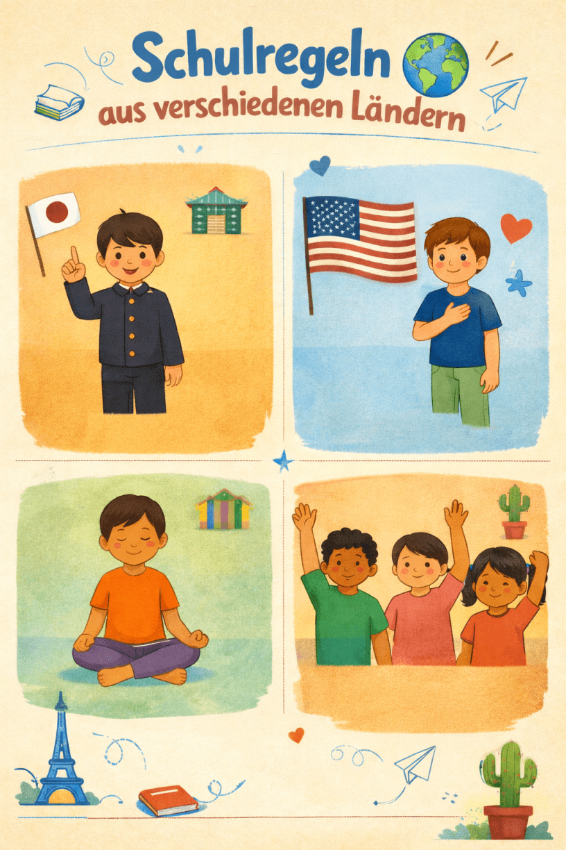 Ein Blick auf Schulen in anderen Ländern zeigt: Schulregeln können sehr unterschiedlich sein. Manche Regeln wirken streng, andere vielleicht ungewöhnlich. Trotzdem haben sie alle ein Ziel – ein respektvolles und gemeinsames Lernen zu ermöglichen.